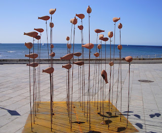 no paredão (ao longo dos dois quilómetros que vão entre as praias das Moitas, Tamariz e Poça) decorre a Edição número zero do ArteMar Estoril, uma exposição de escultura internacional inédita em Portugal, com obras que incorporam resíduos marítimos e/ou representam simbolicamente o mar. Esta iniciativa constitui um dos maiores eventos gratuitos nacionais de escultura ao ar livre. Na imagem uma obra da escultora Jin Jie (natural de Jiangxi, República Popular da China, onde nasceu em 1979, Jin Jie, com formação académica em escultura, concorre com esta obra, denominada "União", de 2009, em que os materiais utilizados são o barro e o ferro, e que representa um cardume em pleno mar. Subjacente a este efeito visual está uma mensagem de conteúdo gregário que louva a solidariedade do grupo como forma de sobrevivência).