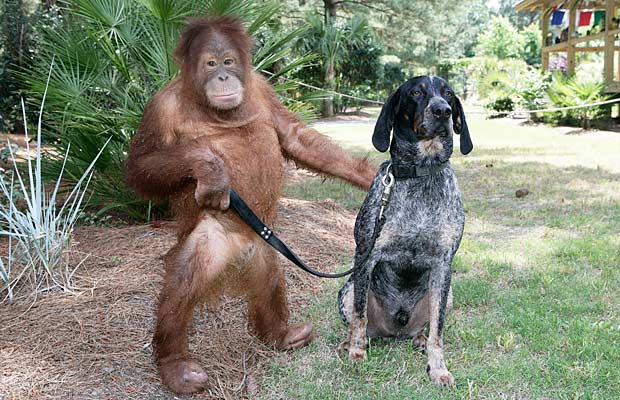 depois de perder os pais, este orangotango de três anos de idade estava tão deprimido que se recusava a comer e não respondia muito bem aos tratamentos e remédios. Os veterinários achavam que ele ia sucumbir. O velho cão foi encontrado perdido nos arredores do zoológico, e quando foi levado para dentro da sala de tratamento encontrou o orangotango, os dois tornaram-se amigos inseparáveis desde então.